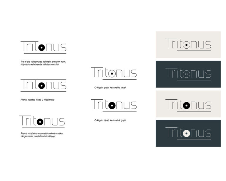 Tritonuksen logo oli merkittävin työn alla oleva graafinen elementti. Tekstilogoa varten kerättiin yhdeksän erilaista fonttia, niin että valinnat pohjautuivat benchmark-materiaaliin. Teemoja olivat muunmuassa pehmeä ja hierarkinen. Valittu fontti ja sen pari siirtyivät jatkokäsittelyyn.