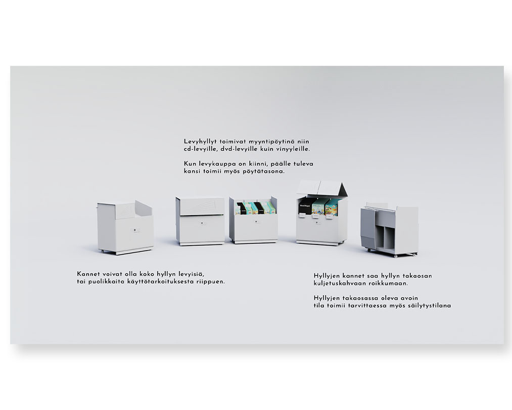 Lopputuloksena esiteltiin 3D-visualisoinnit levykaupasta auki ja kiinni. Näin pystyttiin tarjoamaan selkeä mielikuva modulaarisesta levykauppa-konseptista. Modulaarisuutta korostettiin kuvituksilla siitä, miten levykaupan hyllyt taipuvat myös tarjoilutasoiksi.