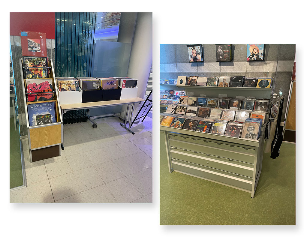 Koska levyhyllyjen modulaarisuutta haluttiin korostaa, hyllyjen suunnitteluun kiinnitettiin erityistä huomiota. Vilkas aulatila palvelee asiakkaita ympäri vuoden erilaisissa tilaisuuksissa ja tilanteissa. Levyhyllyjen pohjaan lisättin renkaat ja hyllyjen kannet suunniteltiin niin, että ne palvelevat myös pöytätasoina levykaupan ollessa kiinni.